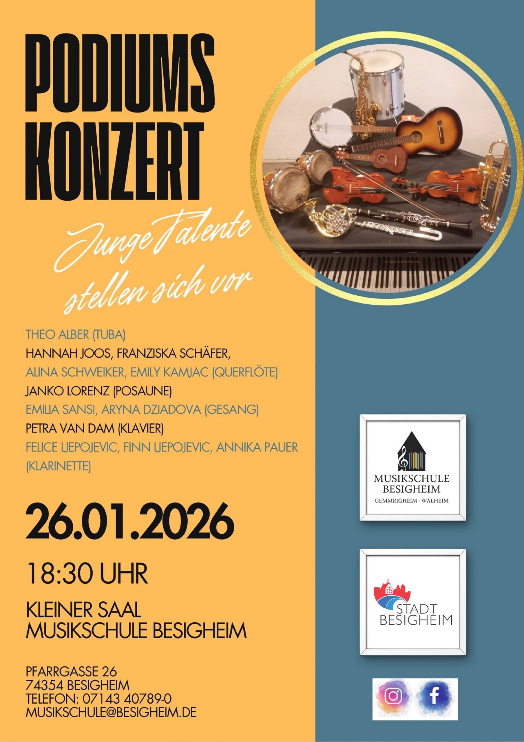 Die Musikschule Besigheim lädt am Montag, 26. Januar 2026, um 18:30 Uhr herzlich zum 18. Podiumskonzert in den Kleinen Saal der Musikschule ein. Der Eintritt ist frei.