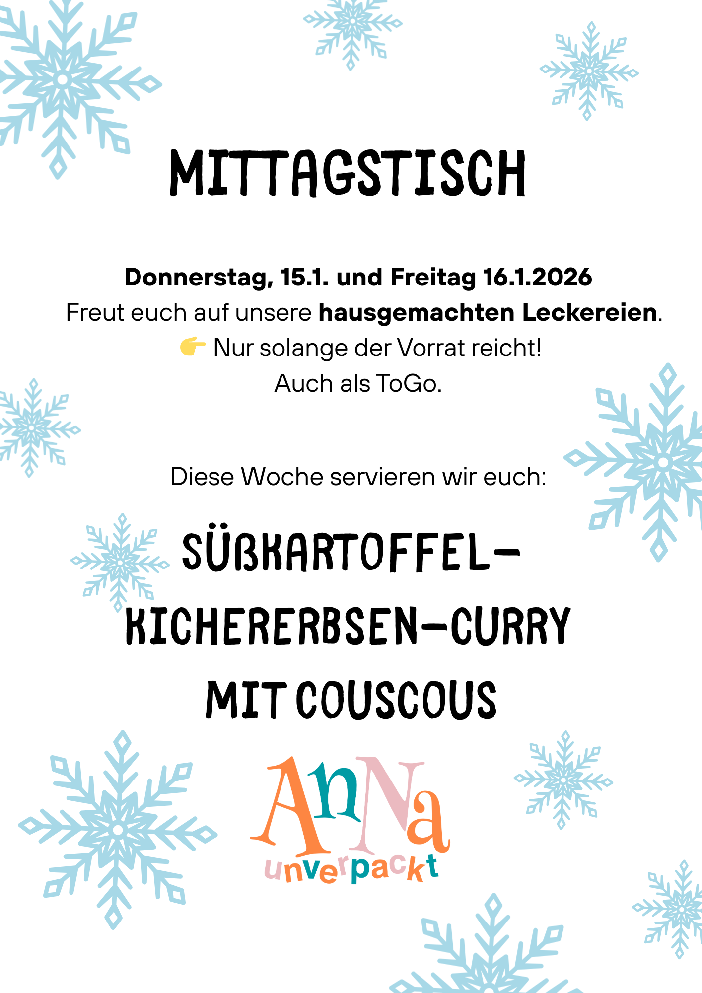 Über die Winterzeit verwöhnen wir euch bei AnNa unverpackt Kaufladen mit hausgemachte Gerichte. Wöchentlich wechselnde Angebote zum Vorort oder ToGo genießen. Gerne könnt ihr euch eure Mahlzeiten vorbestellen unter Tel:07143-7209194 oder direkt im Laden. Das Angebot gibt´s immer solange der Vorrat reicht.